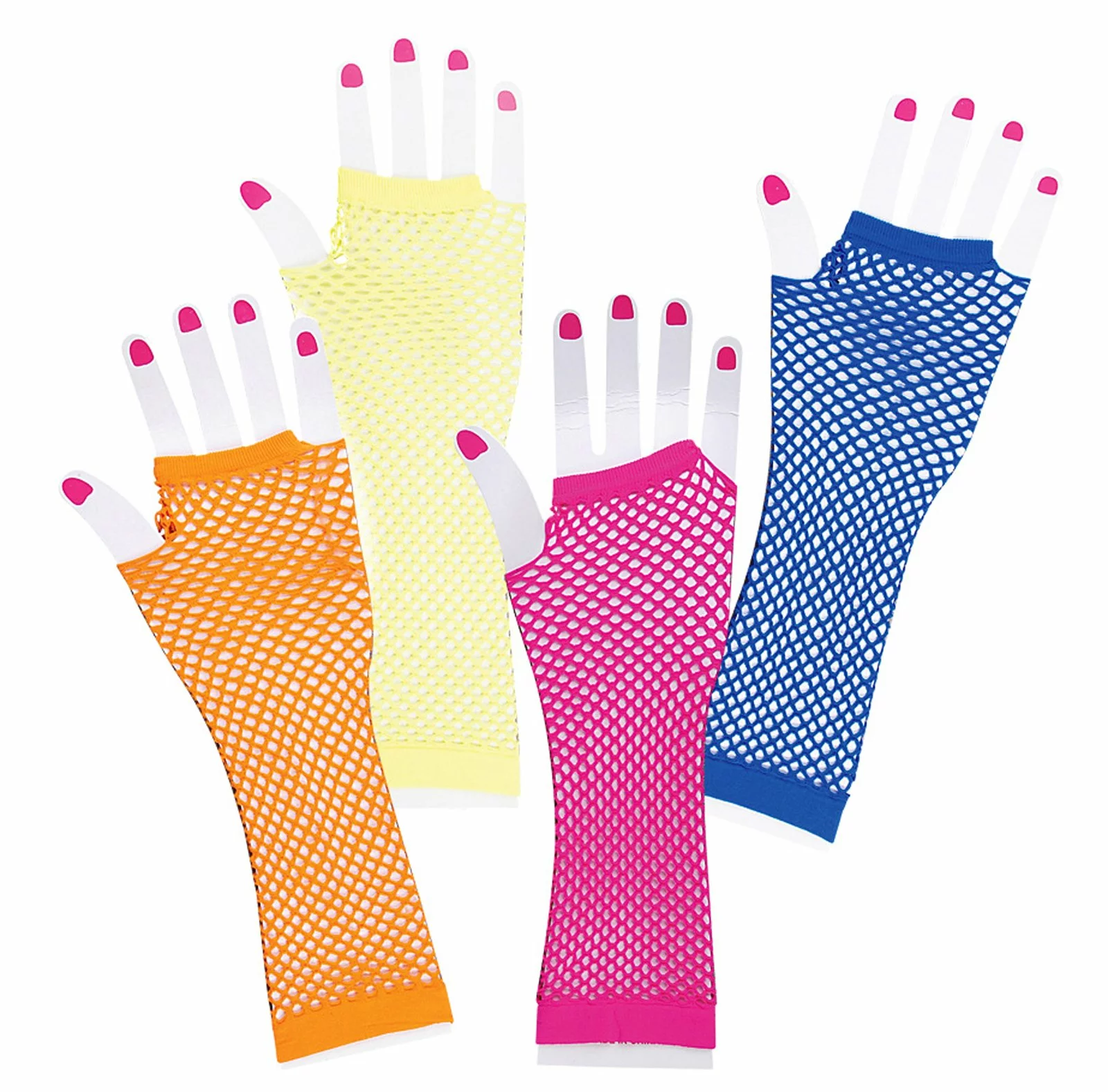Make almost any look pop with cool fishnet gloves! This product includes one pair of Long Fishnet Neon Gloves that come in an assortment of colors (our choice please).