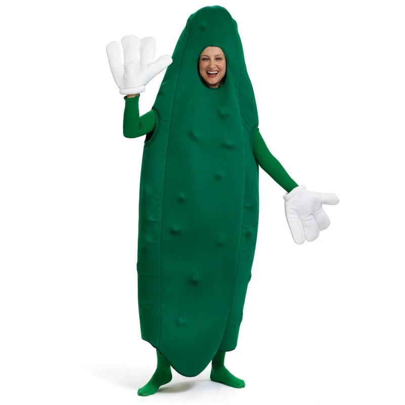 This Pickle adult costume is a one piece full body costume with face cutout.
