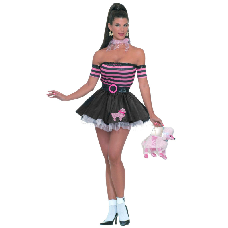 No need to pretend, you’ll be everyone’s favorite party doll! Pretty in Poodle costume includes a black mini poodle skirt with pink poodle, pink crinoline underskirt*, black & pink striped tube top with black sequin trim, black belt with pink buckle, matching arm sleeves, and a pink neck scarf.