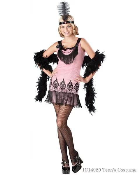Get ready to party this Halloween in fabulous style as a retro flapper girl from the 1920s jazz era. The Teen Flirty Flapper Womens Costume includes a pastel tank dress with black lace trim and a swinging fringed hem for a flirty and playful look that will look fabulous when you’re dancing the night away at your next Halloween party or school dance. The flirty flapper outfit has some fun accessories attached to the dress that teens will absolutely love such as beaded and fringed necklaces, black bow trims, and lace print medallion border at the bottom. Flapper Halloween costumes also come with a feather trimmed headpiece and can be accessorized by adding textured tights, a pair of long gloves, and a feather boa. Costumes are available in sizes that fit most teens up to size 11.