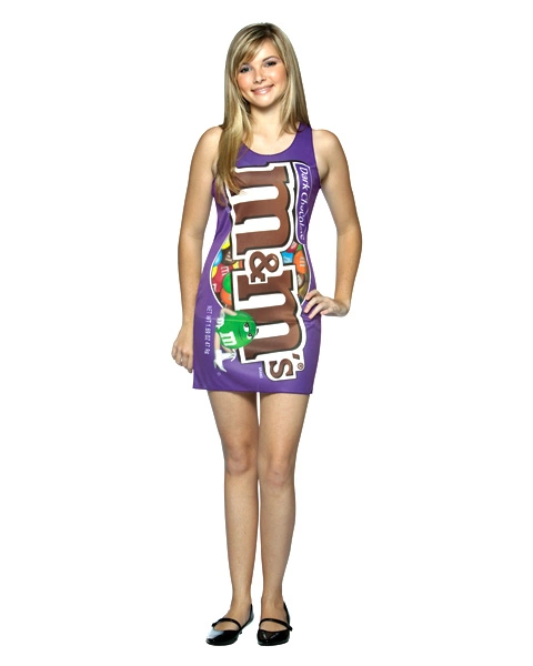 Here is a cute outfit that gives new meaning to â?omelts in your mouth, not in your hands.â? The Teen M & M Dark Tank Dress will make your girl the very tastiest treat at her next party. The M & M dress includes a cute purple tank dress with the M & M’s trademark wrapper on the front. The M & M outfit is available in one standard size suitable for girls in sizes 13 to 16. This is the ultimate in cool and sexy Halloween costumes and you won’t find this costume at a lower price in any retail store or internet web site. Be sure to check out all of the costume ideas for men, women, and children of all ages, as well as the accessories that will make your costume and your next party the very best ever. * Features a purple tank dress with the M and M Dark Chocolate wrapper design on the front. * This is an officially licensed costume.